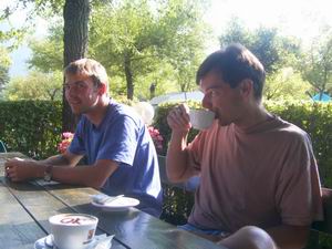 es taucht auch Thomas auf, Frühstück bei mir. Martin, für den als Treffpunkt 8:30h statt der offiziellen 9:00 mitgeteilt war, taucht um zehn vor neun auf. Bei schönstem Wetter geht es am Achensee vorbei ins Inntal und anschliessend zum Brenner. Cappu in der Sonne.