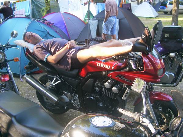 An diesem Tag ging nicht mehr viel. Es war heiss und keiner war dazu zu bewegen, noch eine Nachmittagsrunde zu drehen. Der nahe See war wohl zu verlockend. Erst am frühen Abend war ein paar Leute zu einer kleinen Abendrunde zu bewegen. Das Schmankerl war altbekannt: Die alte K.U.K-Strasse hinauf hoch über den Caldonazzosee in Richtung Lavarone und dann wieder runter nach Calceranica. Während einer Bergabfahrt (meine Motorbremse war gleich null, ich dachte, ich würde auf einem Zweitakter sitzen) hatte ich plötzlich einen Geistesblitz: DAS VENTILSPIEL!!! Ich hatte doch mal so ein ähnliches Problem gehabt, als die Ventilspiel mal zu streng eingestellt war. Abends gab's bairisches Weissbier und italienische Pizza in der Zeltplatzpizzeria. Am nächsten, dem