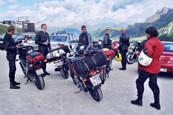 mit regionalen Spezialitäten (OK, bei einigen war es halt "nur" Pasta). Ging es flott nach Meran hinunter. Thomas und ich kamen auf Betriebstemperatur. Zwei gestylte Yamaha R6 Fahrer mussten hilflos zusehen, wie zwei XBRs ihnen mal anschaulich vor Augen führten, wie das mit breiten Reifen und viel Schmalz (PS) ist. Alles für die Katz. Gedanklich wurde in die XBR eine weitere Kerbe geritzt. Es sollten an diesem Tag noch einige folgen (griiiins). In Meran verabschiedeten wir uns beide von Matthias, der über das Engadin heimwärts düste, sowie von Martin, Gernot und Peter, die es etwas ruhiger angehen wollten. Den Jaufenpass hinauf machte es richtig Spass. Den CBR 600 Fahrer zu verblasen, war mühsam, aber letztendlich machbar. Er hatte zwar eine Beifahrerin, dafür hatte ich aber keinen zweiten Gang, was sich bergauf doch als ziemliches Handikap darstellt. Thomas hielt gut mit und ohne Halt rauschten wir auf der anderen Seite des Passes wieder runter. Eine österreichische Superbike Dreiergruppe erwies sich als hartnäckig und als äussert unkooperativ. Die wollten uns einfach nicht vorbeiwinken! Als ich es leid war, die schauerliche Kurventechnik der drei ansehen zu müssen, fassten wir uns ein Herz. Drei Kerben mehr. In Sterzing trennten wir uns, da Thomas die Brennerstrasse fahren wollte. Ich hatte keine Lust, sie zum 5936. Mal zu fahren, noch dazu bei dicken schwarzen Wolken. Also nix wie auf die Autobahn. Im Inntal musste ich die Entscheidung treffen, über den Achensee (schwarze Wolken) oder über Kufstein zu fahren. Natürlich war die getroffene Entscheidung falsch. Am Achensee fing es zu regnen an. Eine Halsstarrigkeit setzte ein, die man kennt, wenn man bei tagelangem schönen Wetter unterwegs war und es nur noch 40 km nach Hause sind. "Das ist nur ein Schauer, das hört gleich wieder auf!". Von wegen. Diese Sturheit verhindert, halbnass den Regenkombi anzuziehen, um wenigstens nicht komplett durchzuweichen. Aber nein. Als sich schliesslich der Lederkombi mit Unterwäsche vollkommen vollgesaugt hatte, empfing mich der Tegernsee mit Sonnenschein. Die restlichen zwanzig Kilometer reichten, um mich auszukühlen. Zuhause rannte ich dann erstmal (unterwegs Kleiderhaufen zurücklassend) zur Dusche, um meine Körpertemperatur wieder zu stabilisieren.
