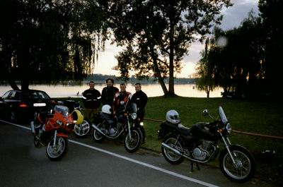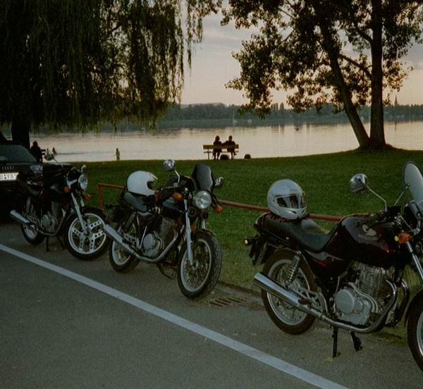 Jetzt war ich also alleine. Mit dem Xbärchen unter lauter grossen Mopeds: SV 650, 600er Fazer und RSV Mille. Ein Kolben und 44 Ps neben RamAir Lufteinlässen, 190er Hinterreifen, riesigen Bremsscheiben mit tausend Kolben, grellfarbigen Verschalungen, Gitterrohrrahmen, Leistung und Drehmoment bis zum Abwinken und Upsidedown Gabeln. Was mach' ich hier überhaupt? (Jo: Denk dran: ein Bär ist ein Bär! Da können die SozialVersicherer nochso lange fazern und millern...;-) Die werden ja immer eine halbe Stunde auf mich warten müssen! Klar, der Robert hätte damit kein Problem gehabt und hätte einhändig und ohne Bremsbeläge mit den anderen mitgehalten. Aber ich? (Jo: Üben...) Dass Robert jetzt anstatt XBR eine SV 650 unter dem Hintern hatte war auch nicht gerade beruhigend. Von Peter hatte ich bis jetzt auch nur gehört, dass er schnell ist. Mami!!
