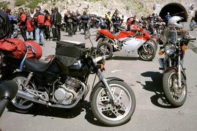 Nächster Tag, gleiches Programm: Kurven , Kurven, Kurven... Nach dem Frühstück ging es los. Zuerst nach Italien rein und sich an ein paar Kilometer Autoschlangen vorbeiquälen in Tirano und Bormio. Nach der bewährten Regel, weiterzufahren wenn es geradeaus geht und anzuhalten bis der Hintermann sichtbar ist, falls man abzweigt, singelte ich dem Rest der Truppe nach. Die Strasse wurde immer kurviger und steiler, meine Freude am Fahren stieg ebenfalls steil an, nach dem mühsamen Stehen in verstopften Strassen. Irgendwann hatte ich eine 1150 GS vor mir, der ich tapfer am Hintern hing, bis sie ein Auto überholte und mich so abhängte. Wusste gar nicht, das so etwas geht mit einer XBR. Abzweigungen hatte ich schon lange keine mehr gesehen. Na ja, was soll's, Hauptsache Kurven. Aber was ist das? Sieht aus wie eine Passhöhe! Stilftser Joch. Da wollten wir doch erst später drüber? Oh oh, irgendetwas ist da gar nicht gut. Von den anderen nichts zu sehen. Ein Blick auf die Karte und ich merkte, dass ich sie vor einer Weile schon verloren haben musste. Was blieb mir anderes übrig, als den ganzen Pass wieder herunterzufahren. In der Nähe von Bormio kam mir dann Mario entgegen. Gottseidank! Wir fuhren über den Passo di Foscagnio nach Livigno, dann über den Passo di Acqua wieder in die Schweiz, die wir über den Ofenpass schon wieder Richtung Italien verliessen. Kurz nach der Grenze traffen wir in einem Gasthof auf Robert und Peter, die sehr erholt wirkten. Heute sind wir ja auch noch fast nichts gefahren, kommentierten sie ihre ausgeruhte Erscheinung. Ha ha!