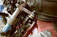 Johannes musste unterwegs schnell anhalten, da sein Tankrucksack so auflag, dass er den Einschlagwinkel beim Motorrad lahmlegte. Als wir einen Tankstopp machten, stellte sich heraus, dass es gar nicht der Tankrucksack gewesen war, der im Weg war. Eine Schraube, die das Zündschloss festhielt, hatte sich gelöst und blockierte den Einschlag! Die zweite Schraube hatte sich schon unbemerkt verabschiedet. Das hätte ins Auge gehen können.