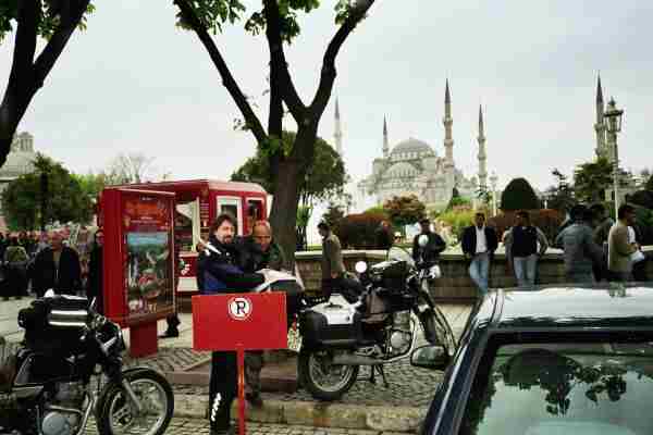 So trafen wir am späten Nachmittag in Istanbul ein um dort erst einmal herumzuirren (Top Kapi ist ein Ortsteil und nicht der kleichnahmige Palast....). Egal nach einigem Gekurve standen wir vor der blauen Moschee, die wir 2 mal umkreisten auf der Suche nach dem Hotel Nezih das ich über das Internet gebucht hatte. Durch Erwerb eines Istanbul Buches (10 Euro) konnten wir den Verkäufer animieren auf einem Roller zum Hotel vor uns her zu fahren (gegen die Einbahnstraße, auf den Straßenbahnschienen und durch die Fußgängerzone....)