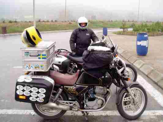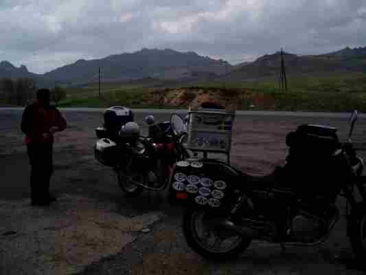 Am Ende der Autobahn beschlossen wir eine kurze Regenkombi-auszieh-und-trink-Pause, da stieß der Varadero Kollege zu uns. Er konnte englisch und so quatschten wir ein bischen. Er meinte mit Blick auf den dampfenden Motor (es trat Kühlmittel aus), daß ihm der Verkäufer erklärt hätte, daß das Mopped 200 läuft. Wir dachten uns: Klar - der Orient naht!