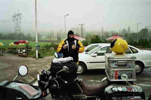 Robert war schon etwas unruhig, als ich kurz vor Mitternacht ankam. Immerhin wollten wir am nächsten morgen um 5 Uhr früh losfahren. Na ja, bei dem Adrenalin vor so einer Reise sind 5 Stunden Schlaf völlig in Ordnung. Morgens also Kaffee rein, alle Thermo Klamotten incl Regenkombi anziehen, und los.....