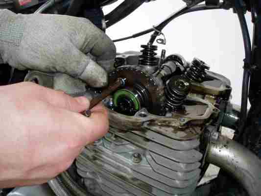 Also Werkzeug raus und Kopfdeckel runter. Sah eigentlich alles ganz gut aus, woher kam das Geräusch? Ich kickte den Motor vorsichtich durch: Oha, die Schrauben des Nockenwellenrads waren locker (so was - ich bin sicher, daß ich die mit Drehmoment festgezogen hatte und ausserdem mit Sicherungsmasse versehen hatte) Der Motor war schnell wieder zusammen - und schnurrte wieder.