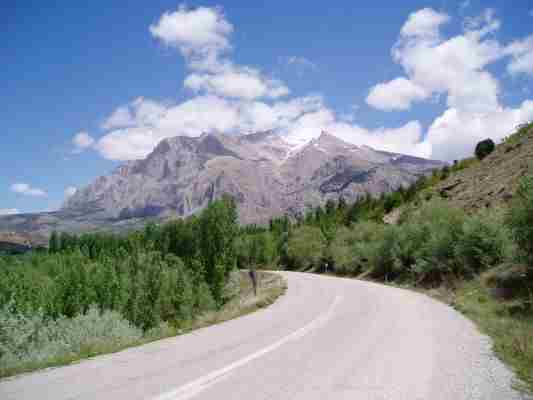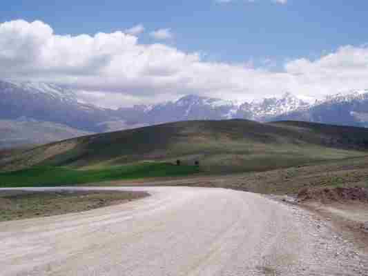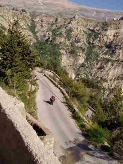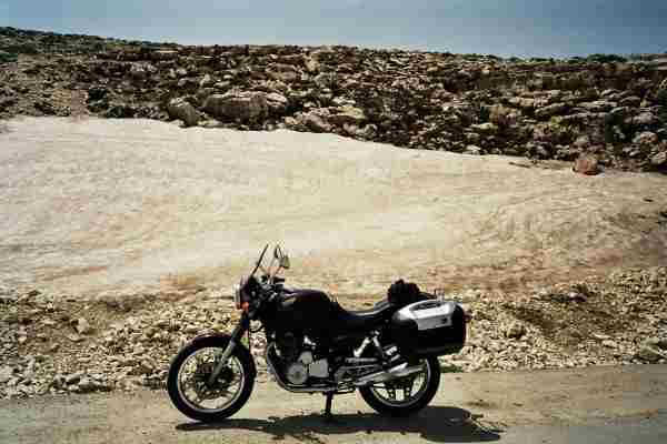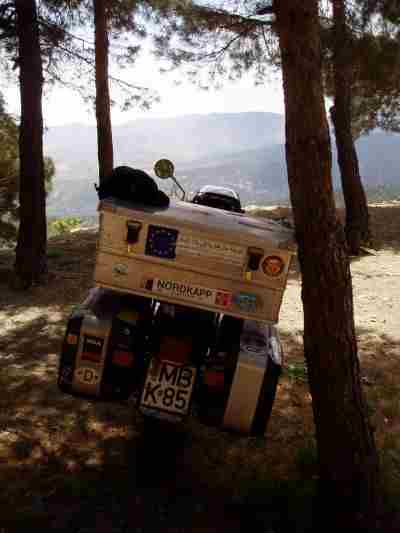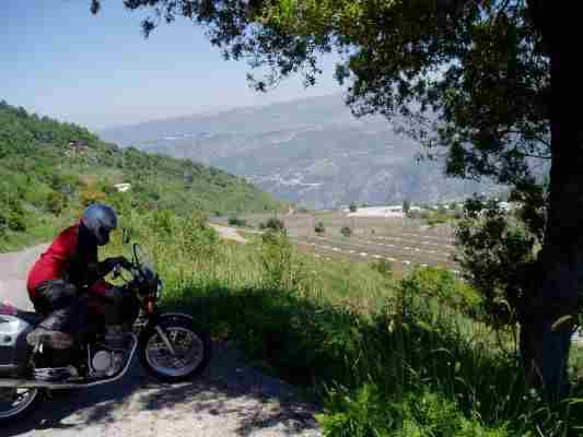 Ich freute mich schon über die Kurvenabwechslung als ich auf einer der unausgebauten Serpentinen des Katara Passes (ca 1700 m) auf dem nassen Kalkteer einen Rutscher (ohne Sturz) hatte. Schon habe ich es bereut statt auf BT 45 auf dem (geschenkten) ME99 unterwegs zu sein. Robert: "Das ist alles nur mental". OK - ich muß schon zugeben, daß ich am Anfang einer Reise immer etwas vorgespannt bin, auch und weil mir im Frühjahr die Routine fehlt. Trotzdem tourten wir gut gelaunt durch die Berge, die immer wieder schöne Aussichten freigaben um dann bei einem Tankstop mal etwas genauer das Öl zu prüfen, die Kette zu schmieren bzw. den Scottoiler nachzufüllen. Die 1000 Km hatten wir schließlich schon fast voll.