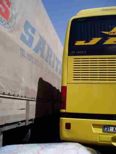 Jetzt wurde es Syrisch. Der Clou war, zwischen den verkeilten LKWs und Bussen noch durchzukommen auf syrisches Terrain.