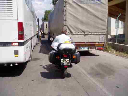 Die Stärkung konnten wir auch gebrauchen; denn am nächsten Tag, dem 1. Mai hatten wir unseren "Iron Butt" Tag. Also mit dem Muezzin, der unser täglicher Begleiter wurde, aufgestanden und die Durchquerung der Türkei angegangen. Als erstes mußten wir "über die sieben Brücken" aus dem Istanbuler Stadtgewirr entschwinden. Da wir mit den türkischen Abkassierautomaten der Brückenmaut nicht klarkamen und die türkische Erklärung aus dem Sprechkasten auch nicht half und weit und breit kein Mensch oder Kassenhäuschen zu sehen war entschlossen wir nach einer Weile ohne Bezahlung weiterzufahren, immerhin tauchte kein Blaulicht oder so auf.
