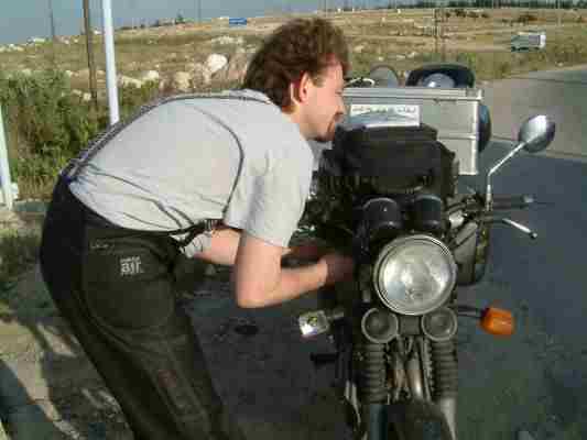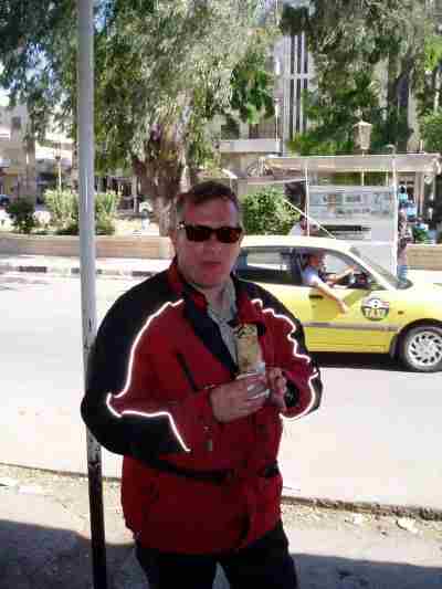 Das Blinkerglaserl wird um die Moral wieder zu kitten mit Panzerband hingeklebt und das Ausrichten der Gabel und Hebel wirkt als Arbeitstherapie gegen den Schock. Nochwas trinken, eine Aspirin dazu. OK kann weitergehen. In Aleppo abends im Hotel sind wir dann beim Anblick der "Blauen Platte" schon wieder zu Scherzen aufgelegt.