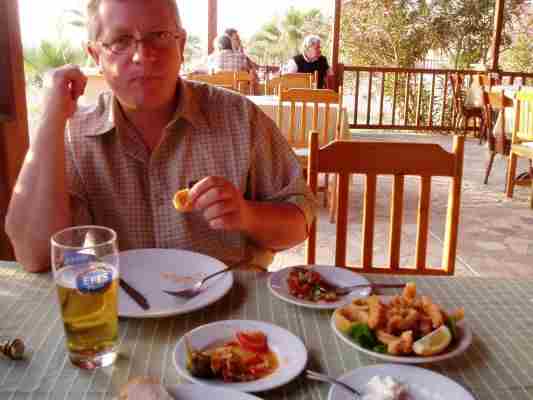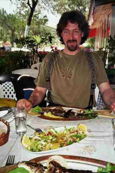 Beim nächsten Tanken machte mein Motor unangenehme Geräusche im Kopf, oh Mann, kann doch gar nicht sein. Sofortige Strafe für Hochmut? Ist doch alles neu.... na ja, Ölstand war noch gut und die Farbe des Öls auch noch nicht erschreckend. Egal dachte ich mir, das muß halten... Eine der selbst auferlegten Regeln "Fahre niemals im Dunkeln" mußten wir dann auch brechen und wirklich ist es schon unheimlich, wenn einem in nachtschwarzer Dunkelheit unbeleuchtete Fahrzeuge zweispurig entgegenkommen. Nach nochmaligem Tanken in der Dunkelheit erreichten wir das Hotel, das ich auch im Internet gebucht hatte nach mehrmaligen Fragen und langen Suchen. Der "Pascha", der einst in Deutschland als "Ingenieur " gearbeitet hatte, lud uns staubige Brüder erst mal ganz orientalisch zum Tee und horchte uns ein wenig aus. Aha, nach einer Weile war klar, "Neffe Kemal" in Deutschland hatte das im Internet eingerichtet, angekommen war die Info nicht.... Zimmer mit Meerblick bekamen wir trotzdem und Abendessen wurde uns trotz später Stunde auch noch gerichtet.