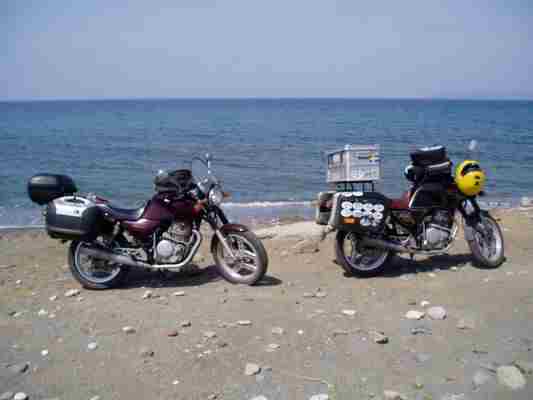 An der Küste endlich auch Temperaturen, die man als angenehm bezeichnen kann. Jetzt habe ich mein Mopped fast auf Neuzustand hingepflegt und? Der Druck der 600 ccm hat offensichtlich die Prallbleche im betagten Auspuff losgeschüttelt und die BMW Fahrer im Hafen sehen mitleidig auf meine Kleine hernieder.... Links hatte ich das schon, Krümmerinnenrohr losvibriert, mein Schweißer hat das in 3 Bohrungen festgeschweißt, hätte ich rechts auch gleich machen lassen sollen. Robert hat es gefreut, endlich ist seine mal nicht der Underdog....