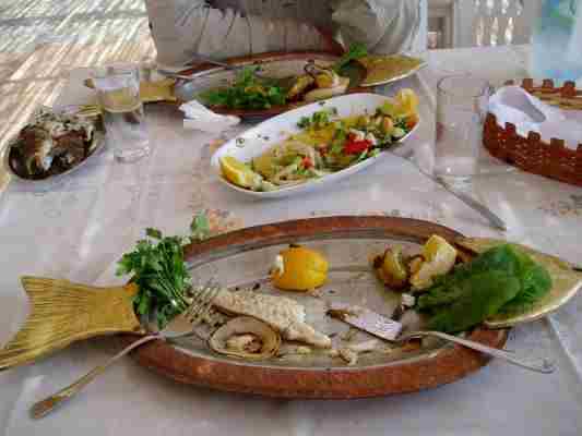 Vor Ort wurde auch echt Action geboten. Nachdem sich mein Magen als wieder eingerenkt bewies, gönnten wir uns noch ein Abendessen in einem empfohlenen Restaurant das offensichtlich von "Christen" besucht wurde. Erkennen konnte man das an den Kettchen im Dekolte und der Speisekarte, in der Wisky in 0,75 Liter Flaschen angeboten wurde. So wurde er auch getrunken. Wir gönnten uns "bescheiden" eine Flasche weissen Ksara zum Fisch. Es war "Weißer Sonntag" und noch eine Hochzeit also echt eine Party......Die Oma hat getanzt....