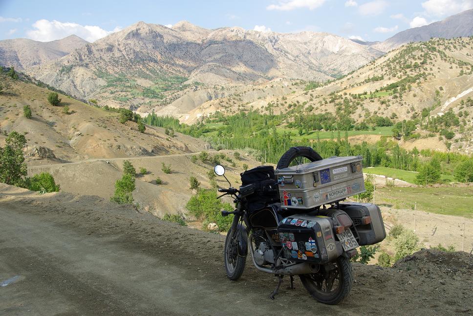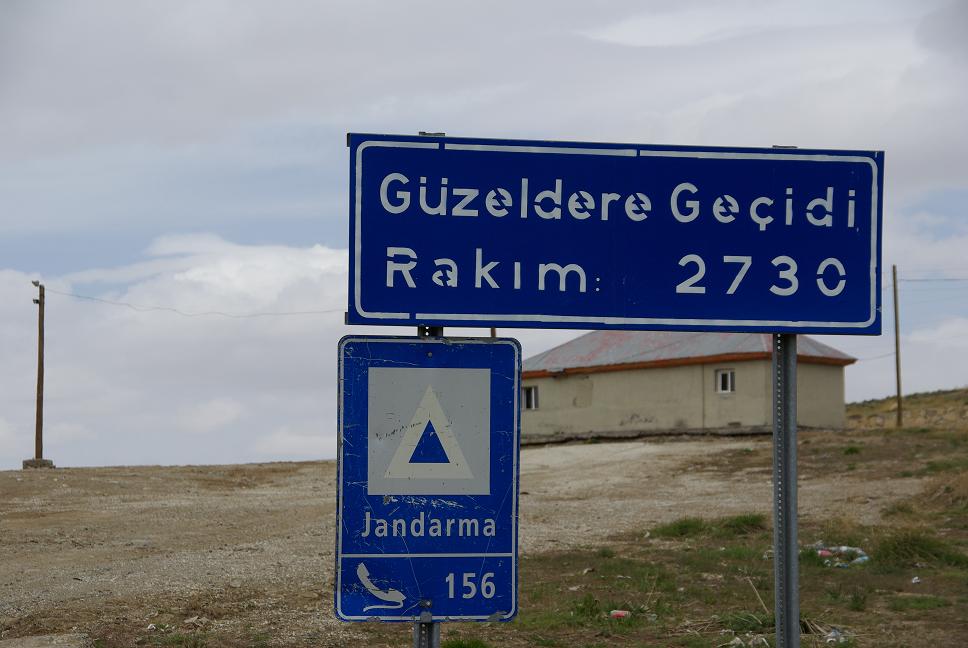 Die XBR fuhr sich mittlerweile etwas teigig, aber das war ja kein Wunder, ich hatte noch kein einziges Mal den Reifenluftdruck überprüfen können. Alle Tankstellen führten keine Luft! Weiterfahren... Was dann auf den nächsten 200 km folgte, war eine einzýge Schickane: Militär-checkpoints. Sechsmal angehalten worden, dreimal Pass regiestriert, einmal Fragebogen ausfüllen, einmal Gepäck aufmachen und eýnmal Gepäck durchwühlen lassen. Da schwoll mir der Kamm. In tat meinen Unmut lautstark kund, zur Sicherheit in tiefstem Bairisch (versteht doch keiner, oder? Sehe ich vielleicht aus wie ein Waffenschmuggler für die PKK? Grummel... Die Landschaft war dafür sehr schön und ich war froh, dass ich am Vortag im Iran geblieben war, denn es tat sich tatsächlich keine Unterkunft auf, ich hätte bis Van fahren müssen, das waren 200 km! Der höchste Punkt der Reise war erreicht: