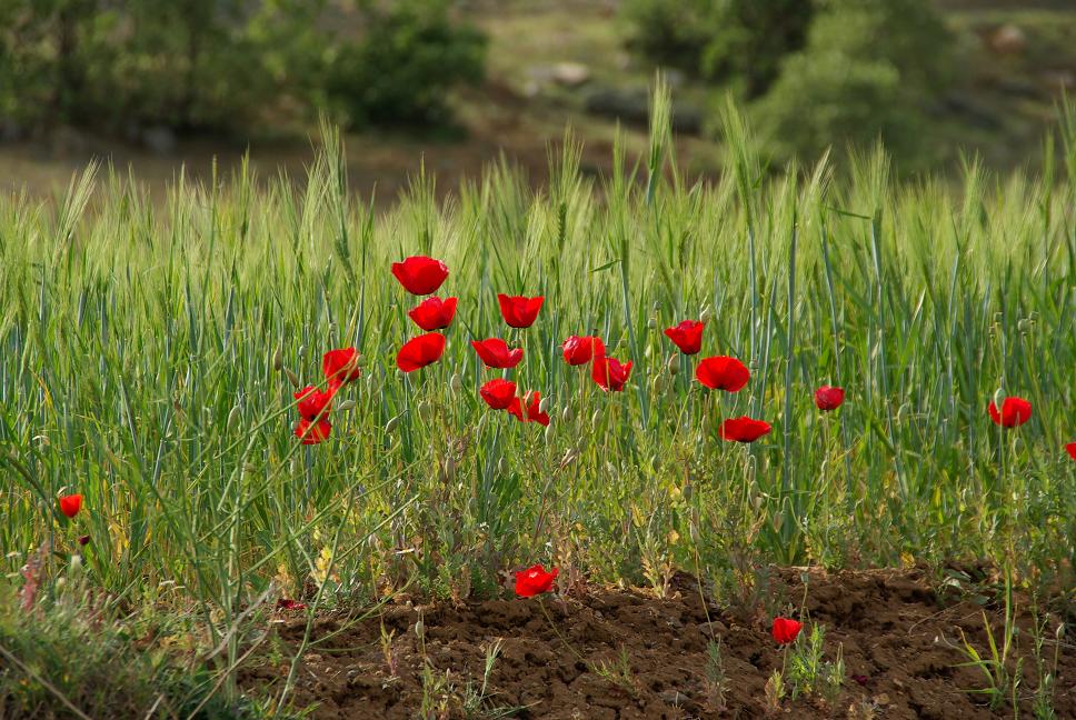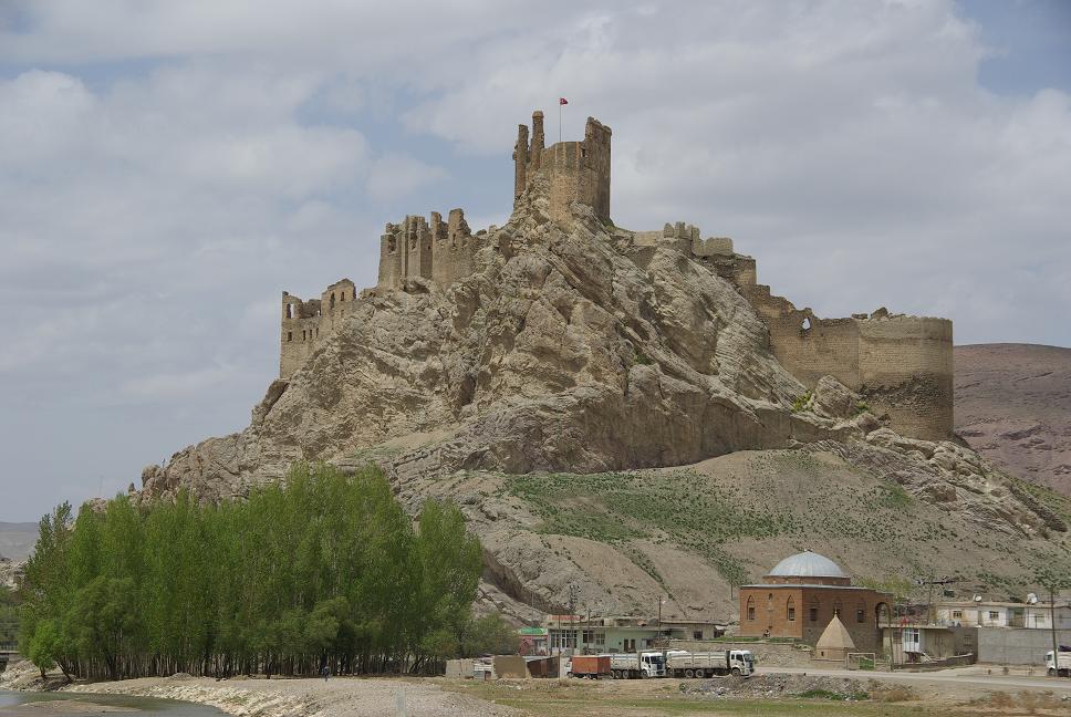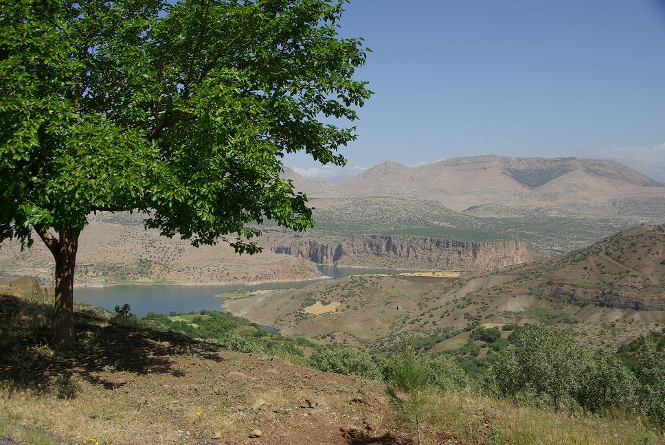 Etwas später ging es auf einmal abwärts, und zwar gewaltig. Aha, einee Schlucht, in die der Vansee abfliesst! Das Dumme war nur, dass am Horizont eindeutig Regen zu erkennen war. Also ran an eine Tankstelle und zum erstenmal meine Regensachen angezogen. Die überhandschuhe waren neu, aber leider zu klein (urgs). Nach einer ganzen Weile (leider eine Einladung zum Tee ausschlagen müssen) war ich endlich soweit und tatsächlich fing es bald zu nieseln an. Nix schlimmes, aber die immer schlechter werdende, kurvige Flickenteppischstrasse was nass und senkte das Tempo erheblich. Zwei Stunden ging es so dahin, bis die Strecke wieder gerader wurde. Das war also tiefstes Kurdistan. Sehr fruchtbar, wogende Weizenfelder, leider zu nass zum fotographieren. Es regnete auf den letzten 100 km etwas stärker und ich musste feststellen, dass ich die XBR leider doch nicht ganz wetterfest bekommen hatte. Zündaussetzer bei Vollgas, ächz. Aber ich schaffte es kurz vor der Dämmerung noch nach Diyarbarkir. Rein ins Zentrum und ins erstbeste Hotel. Das war ganz OK, daneben war gleich ein Restaurant, wo ich endlich mal kein Kebab, sondern geschmortes Lamm bekam. Anschliessend einen Spaziergang an der beleuchteten Stadtmaür gemacht. Zur Nachspeise Baklava gekauft (pappig).