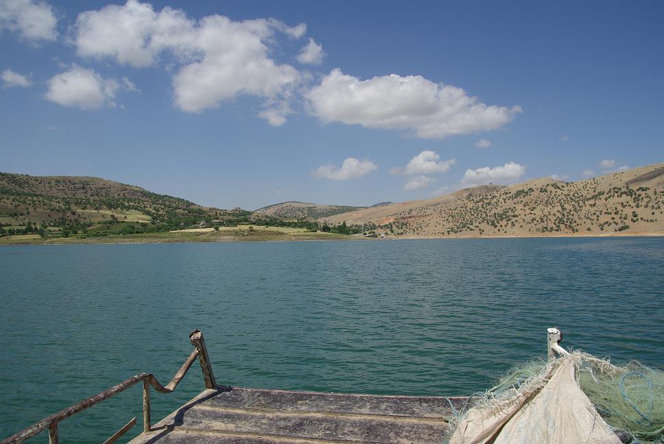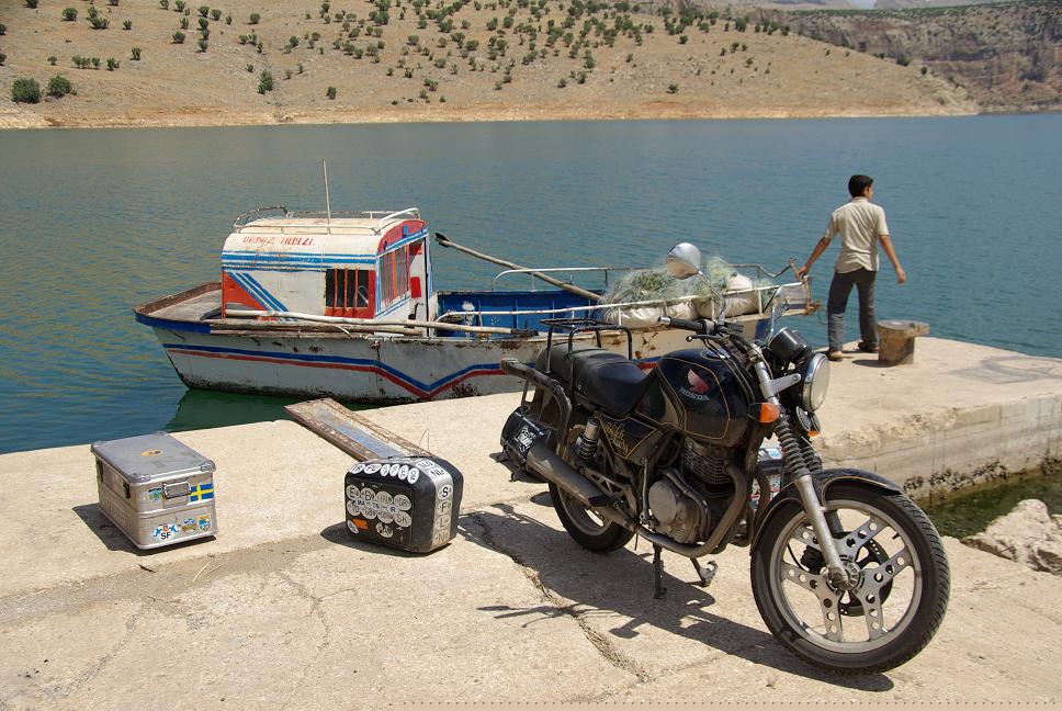 Laut Karte sollte eine Fähre über einen Seitenarm des Atatürkstausees führen. toll, eine Bootsfahrt ist auch dabei! Die Strasse hörte plötzlich auf und ein Fischer kam auf mich zu. Ich verstehe nur wenige Worte Türkisch, aber "Boat" und "Yok" machten mir klar dass es kein Fährboot gab! Neiiiiiin! Das bedeutet 300 km Umweg! Aber der Fischer machte allen Ernstes den Vorschlag die XBR mit einem kleinen Fischerboot zu schippern! Das konnte doch nicht sein! Das geht doch gar nicht! Oder? Ich sah mir das genaür an. Obwohl....neinneinnein, ohne Steg und kaum Platz auf dem wackeligen Boot....dochdoch meinte der Fischer, das geht. Rund 20 Euro wollte er dafür. Na gut, ein Versuch war es wert. Ich montierte das GEpäck ab und sie brachten das Boot. Aber wie bekommen wir sie da drauf? Ich bestand auf einer Planke. Wurde gefunden. Und wie hält das Boot. Mit blossen Händen? Aargh! Ich bestand darauf, dass sie es wenigstens mit einem dünnen Strick am Ufer festbanden. Dasgehtnichtgutdasgehtnicht gut...Tief Luft geholt und die XBR auf das Heck geschoben.