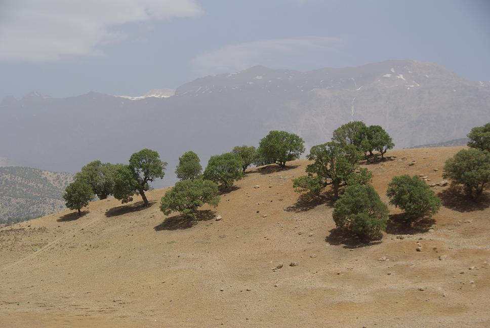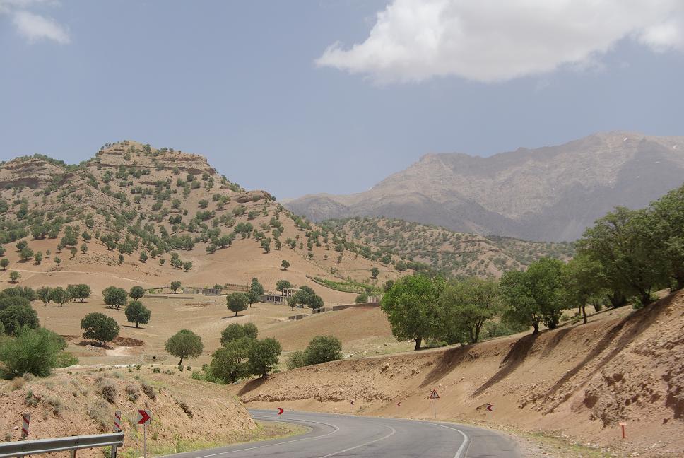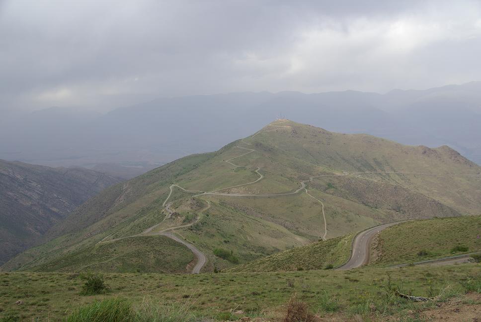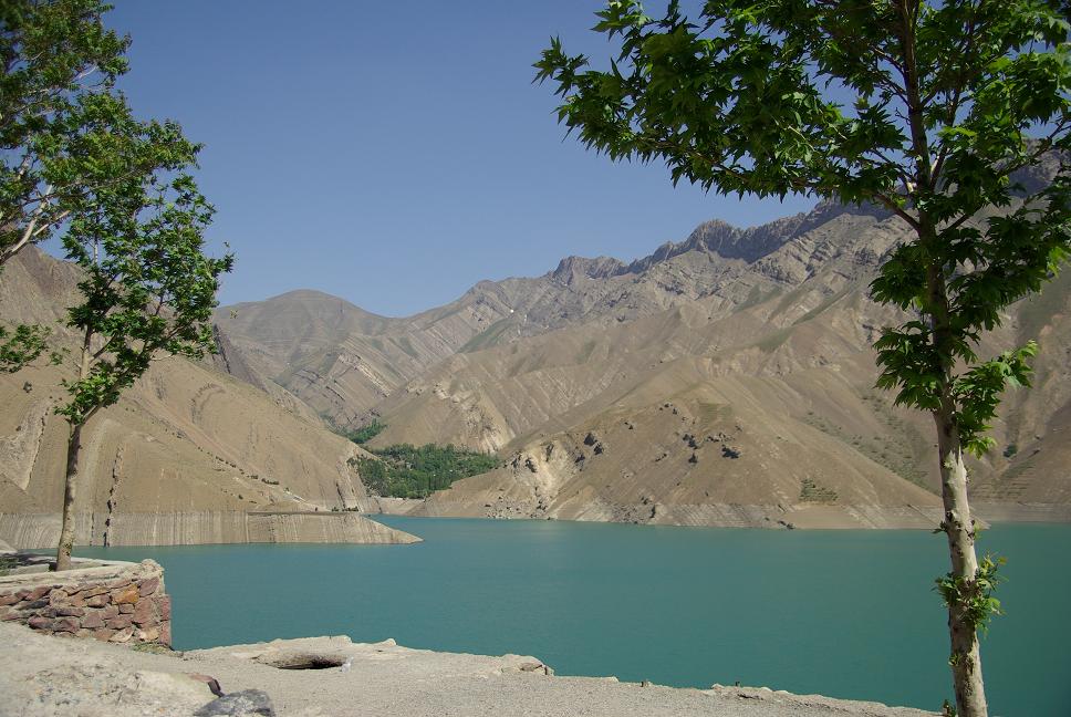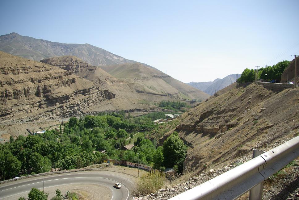 Um Teheran herum war auf einmal ein Mordsverkehr und ich war froh, Teeran ausgelassen zu haben. Da fahren Durchgeknallte rum, das ist nicht zu fassen! Es daürte eine Stunde, bis ich dem Moloch wieder entkommen war. Bei Karaj fuhr ich von der Autobahn runter und fuhr ins Elbrusgebirge, zuvor aber noch eine Stärkung (Kebab und Reis, logisch). Es war bereits nach drei, aber ich hatte schon über 500 km hinter mir. Jetzt kam mal Genussfahren. Eine tolle Landschaft, richtig alpin, grün, hochalpin, mit den schneebedeckten Viertausendern, Talsperren.