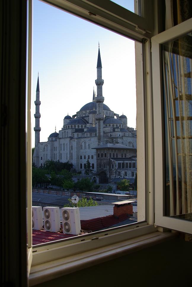 Im vierten Hotel hiess es, ein Zimmer wäre noch frei, für 120 Euro. Ich schluckte, aber mir war klar, dass die Sucherei noch lange daürn könnte. Die Mutter des Hauses unterhielt sich mit mir und erzählte, dass sie 30 Jahre in München Neuperlach gelebt hatte und dass das Hotel jetzt ihre Altersversorgung sei. Sie senkte den Preis auf 100 Euro und ich willigte ein. Viel billiger wird's nicht in Istanbul und die Nacht zuvor in der Absteige hatte ich gerademal 10 Euro gezahlt. Also was soll's. Dafür war dass Zimmer der Hammer. Einer der besten Ausblicke in ganz Istanbul, mit Meerblick und direkt gegenüber der blaün Moschee!