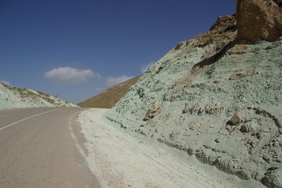 Die Strecke war schön kurvig und ich machte einige Fotos. Die Nebenstrecken sind eben doch die bessere Wahl als "deathtraps" Schnellstrassen (Lonely Planet). Es ging immer höher hinauf und ich war froh, meinen Fleecepulli angezogen zu haben. Dennoch frierte ich bald, denn es ging hoch hinauf, meine Schätzung war ca. 2500m. Saukalt war es auf einmal. Plötzlich wurde mir klar, was hier wohl abgebaut wurde. Der grüne Fels dürfte ja wohl deutlich auf Kupfer hindeuten.