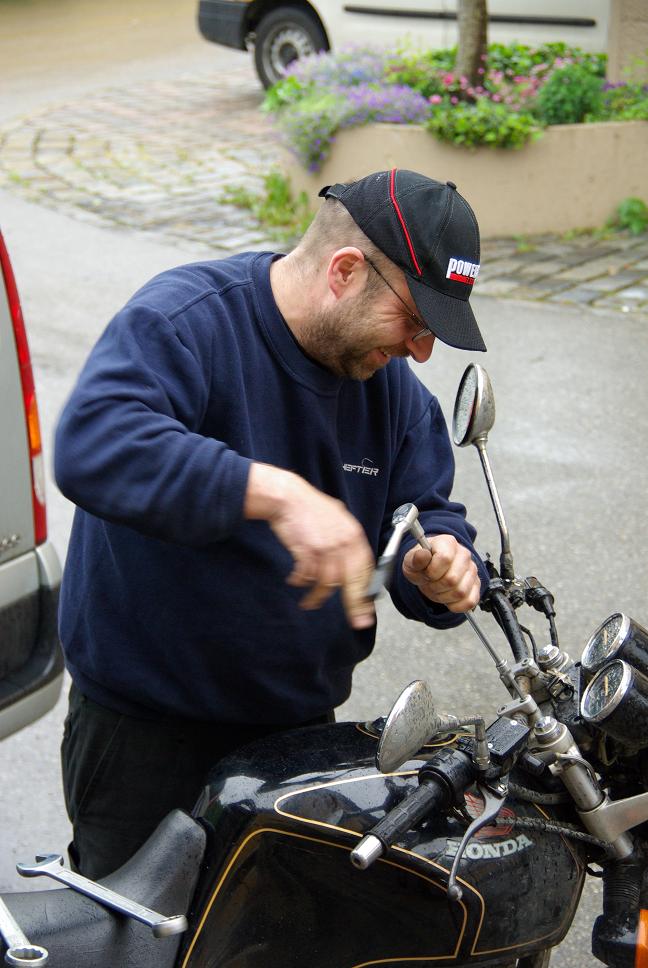 Mangels Entscheidungsfreudigkeit doch im Hotel gespeist. Am nächsten Morgen spazierte ich kurz vor sieben in den Frühstücksraum und dachte mir "der sieht doch aus wie....nein, das kann nicht sein....täuschend ähnlich...wie aus dem Gesicht geschnitten...". Tatsächlich, vor mir stand der Leiter der Nachbarsabteilung aus meinem Institut. Unfassbar! Zufälle gibt es aber auch. Wir frühstückten zusammen, danach ging er Vortrag halten und ich aufsatteln und in Regenkombi wursteln. Es fing auf dem Weg nach Ljubljana zu nieseln an, ich hatte meine Kreditkarte in die Außentasche des Kombis gesteckt und bracuhte so nicht daürnd an den Zahlstellen die Handschuhe auszuziehen. Eben mal über die Grenze nach Slowenien und schon war ich in Euro-Land. Je näher ich den Alpen kam, umso stärker regnete es. Nach Villach war es Mittagszeit und ich gönnte mir eine üppige Pause bei Schweinsbraten, Knödel, Gösserbier und Apfelstrudel, schleck. Ordentlich gestärkt ging es durch die Alpen im Katschberg- und Taürntunnel. Ordentlich frisch war es schon, aber ich war ja dick eingepackt. Ich erreichte bald den Grenzübergang Bad Reichenhall und suchte den Zoll auf. Mit tropfendem Regenkombi betrat ich die heiligen Hallen, was für ein Unterschied zu den orientalischen Zollgebäuden. Ein Beamter hörte sich mein Spüchlein an und haute dann, ohne sich die XBR im Regen anzusehen, mir die benötigten Stempel über die Wiedereinfuhr der XBR in das Carnet de Passage. Eine halbe Stunde später bog ich von der Autobahn ab und besuchte Mart!n in seiner Werkstatt in Traunstein. Viel Benzin- und Reisegespräch. Als er meine XBR wegen der Gabelprobleme kurz Probe fuhr, bemängelte er das Taumeln und überprüfte das Lenkkopflagerspiel. Ein mächtiges Klacken zeugte von ordentlich Luft! Er zog das Lager wieder sauber fest