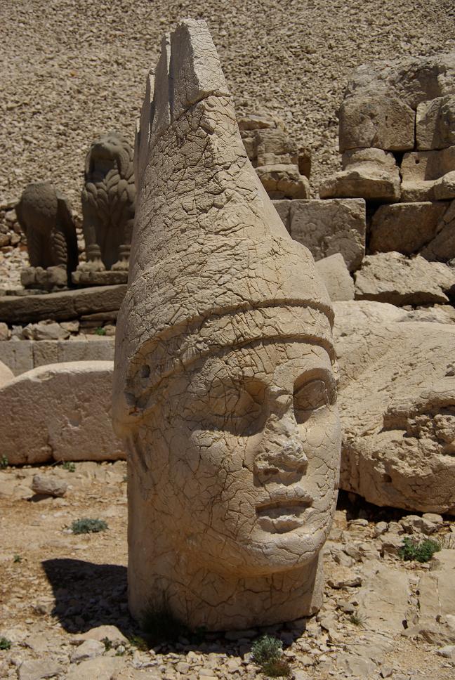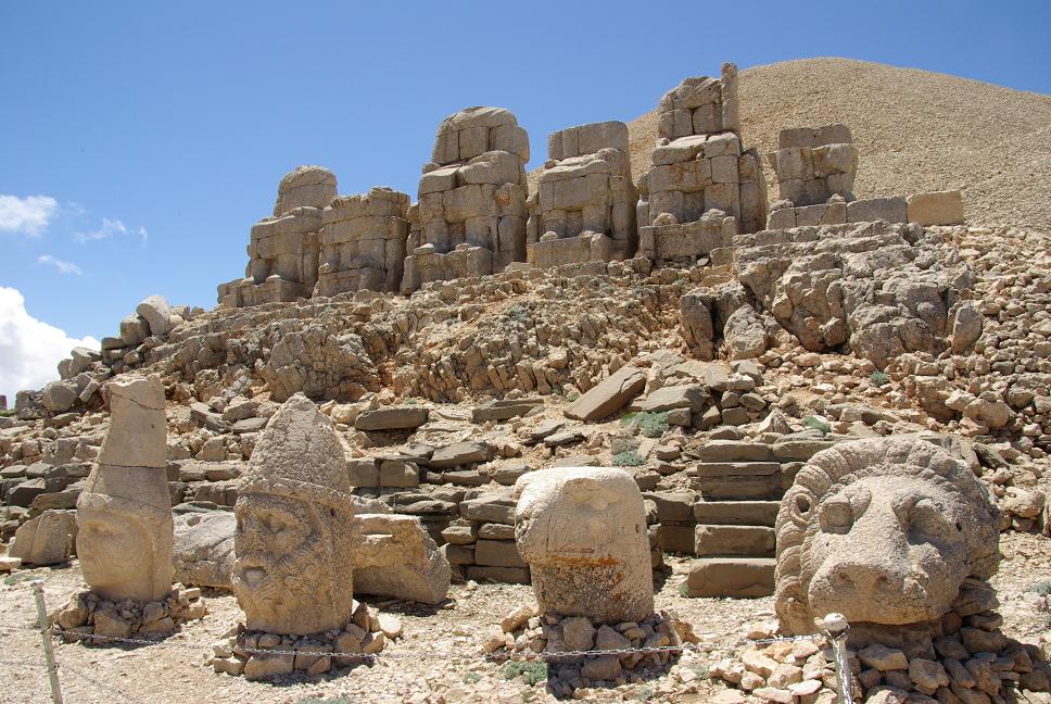 Einige Kurven weiter war Endstation und ich musste eine Viertelstunde zu Fuss hoch. Auf den Gipfel, der aus reinem Schotter besteht, kann man nicht steigen, aber drumrum. Es gibt eine östliche und eine westliche Terrasse. Das besondere an diesem UNESCO-Weltkulturerbe ist: König Antiochus liess zwei Tempel an zwei Seiten errichten, mit enormen Götterstatün. Auf der einen Seite sind sie noch gut erhalten, nur die Köpfe liegen davor.