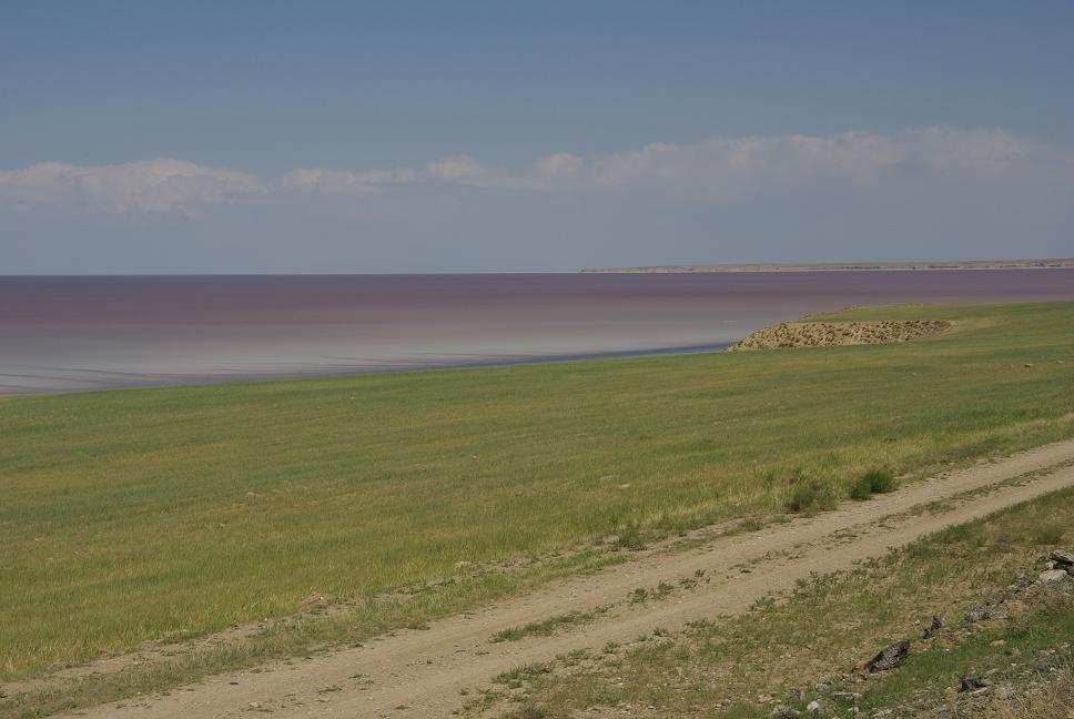 Ich genehmige mir in dem anliegenden kleinen Laden noch einen Tee und düste dann wieder weiter. Je weiter ich nach unten kam, umso unspektakulärer wurde die Landschaft, der Nordwesten Irans (Provinz West-Aserbadjan, sic) ist ein Hochland mit einzelnen kleinen Bergen dazwischen. Es ging flott voran und irgendwie fand ich nichts einladendes zum Mittagessen. In Miyandoab tankte ich, mit dem üblichen Schwätzchen, und verirrte mich beinahe im Stadtgewirr. Hier im Nordwesten wird inden Städten auf die lateinische Beschriftung verzichtet. Aber ich kam schon klar mittels Himmelsrichtungen und Durchfragen. Es flott war das jetzt und das Wetter war klasse. Ich grübelte eine Stunde lang darüber nach, ob ich es wagen und heute schon in die Türkei rüberfahren sollte, ich war früh dran. Am Ende siegte die Vernunft, ich weiss nicht wie lange die Grenzabwicklung daürt und bis nach Van wären es 200 km über zwei hohe Pässe. Unmöglich also. Wie Versorgung mit Unterkünften bis dahin aussieht, ist rätselhaft. Ich kam am Orumiyeh Salzsee vorbei, der weiss bis violett (!) leuchtete, war aber schwer auf Bildern festzuhalten. Ein Versuch: