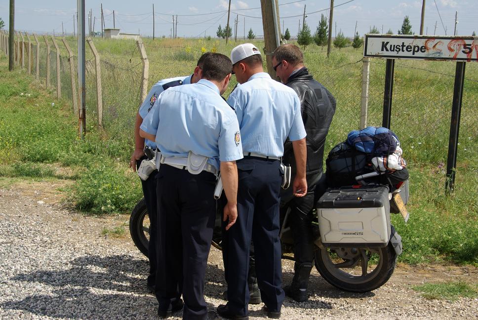 Bald war wieder die Hauptstrasse erreicht und mir wurde klar, dass ich viel Zeit verloren hatte, wollte ich an dem Tag noch Kayseri. Ich liess es laufen, so um die 120 bis 130 km/h, sonst kommt man ja nicht vorwärts in diesem Riesenland. Plötzlich wurde ich von der Polizei angehalten....Ich war an einer Stelle, an der ich relativ langsam unterwegs war, mit 92 km/h geblitzt worden. Ich versuchte mich dumm zu stellen, aber es nutzte nichts....Statt 90 auf Landstrassen gilt 70 für Motorräder! Die belgischen Biker kamen daher und hielten an. Ich unterhielt mich auf Flämisch mit Ihnen damit die Polizisten nichts mitbekamen. Einer von ihnen war auch Polizist und versuchte vergeblich, sie vom Ticket abzubringen, incl. Dienstausweis.