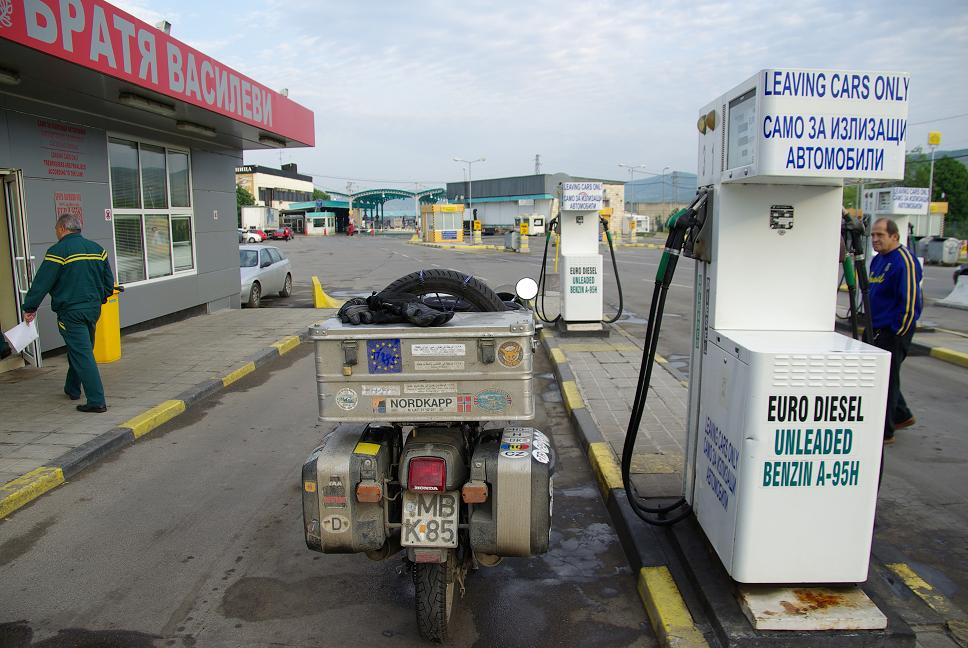Auf die XBR und los. An der Küste entlang ging es zum Flughafen und auf die Autobahn. Ich liess es bei 100 km/h bewenden, denn so hoffte ich bis Edirne nicht mehr tanken zu müssen. Thracien ist sehr grün, sanfte Weizenfelder und relativ flach. In Edirne vertankte ich nochmal meine restlichen türkischen Lira. Vor der Grenze stauten sich die LKW über 20 km! Es war Sonntag, sollte es daran liegen oder die war es nur die typische Effizienz der türkischen Zöllner? Verglichen mit anderen Grenzen ging es flott in einer halben Stunde über die Grenze. Zu meinem Erstaünen verlangte keiner das Ticket zu bezahlen. Auf bulgarischer Seite bekam ich einen Memorystick, den ich an jeder Stelle insgesamt fünfmal hergeben musste. Vernetzte Rechner haben sie anscheinend noch nicht. In Bulgarien hielt ich kurz an, tauschte Geld und genehmigte mir ein Schinkensandwich von trauriger Konsistenz.