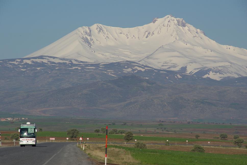 Morgens um 5:30 weckte mich das Handy und um 6 Uhr gings los. Der Reif auf dem Moped fing gerade an zu taün, das Wetter war prima, aber die Temperaturen knapp über Null. Ich düste los, Kilometer machen. Ich war heilfroh, die Strecke nicht am Vorabend gemacht zu haben. Es war saukalt, meine Finger schmerzten vor Kälte, ich wünschte mir die Heizgriffe meiner BMW. 45 Grad im Oman und jetzt über 40 Grad weniger, die Reisezeit war doch gut gewählt, ein paar Wochen früher wäre in Anatolien nicht lustig gewesen, in der Hochebene war es die ganze Zeit kühl. Der Ausblick auf der Strecke nach Kayseri war zwar toll, doch auch eher fröstelnd: