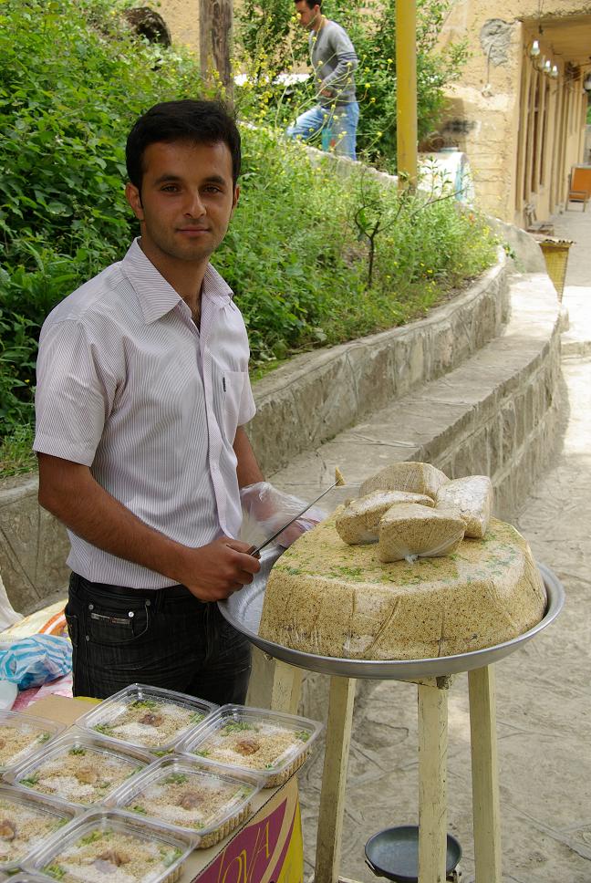 ...es sind lauter iranische Touristen, die hierher kommen, aber es gibt trotzdem allerhand Krimskrams und Souvenirschund. Ein Iraner mit einer modernen Nikon sprach mich an, leider nur auf Farsi, was die Konversation etwas erschwerte. Wir machten gegenseitig Fotos mit der anderen Kamera. Sein Tauschangebot nahm ich aber nicht an, hehe. Danach auf einer Terrasse Mittag gemacht...richtig! Chicken Kebab mit viiiiiel Reis. Bei einem Verkäufer erstand ich noch etwas Nachspeise, eine Art kandierter Sesam, den ich noch den ganzen Nachmittag zwischen den Zahnlücken hervorpopelte.