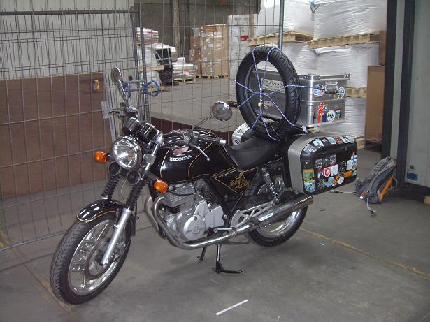 Tja, wenn man alle wichtigen Leute dort kennt.....Juhu, war's das? Nein, das Kennzeichen! Zu der Behörde gedüst und von einem Wichtigtür mitteilen lassen, dass sie um 3 bereits geschlossen war. Problem! Grosses Problem!! Ich erinnerte mich an das Hubb Forum und meinte, dass ich kein Kennzeichen bräuchte. Kurzes Überlegen, dann beschloss ich es zu riskieren, raus mit der XBR aus dem Hafen und sehen was passiert. Zurück zum Lagerhaus, und Leute organisiert, die mir die Kiste zerlegten. Erst nach mehrmaligen nachfragen, denn auf den Zollpapieren stand "1 Kiste", was passiert aber, wenn statt einer Kiste ein Motorrad rausfährt? So, alles ans Moped drangebaut, Trinkgeld an die indischen Arbeiter gegeben, die mir bei der Kiste halfen.