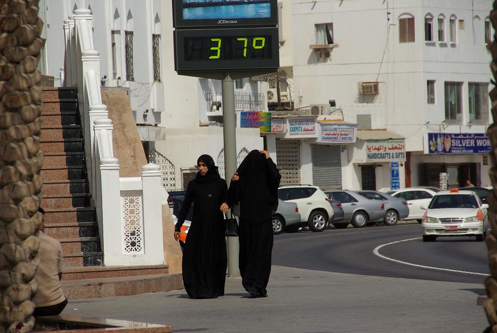 Ich hatte Ausblick auf ein Thermometer. Wenigstens schwitzten die vorbeieilenden Inder auch. Omani in ihrer traditionellen Kleidung wohl nicht, da war für gute Durchlüftung gesorgt. Im Laufe des Frühstücks stiegen die Tempreaturen von 35 auf 37 Grad, bis um 9:45 38 Grad erreicht waren.