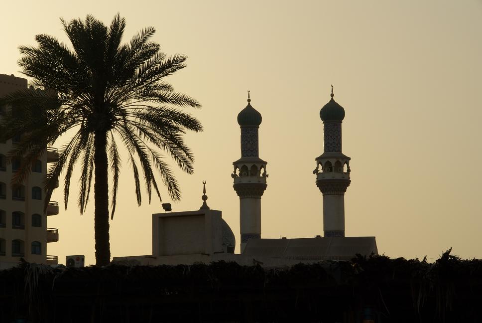 Ich versprach, auch ihm ein Foto zu schicken. Ich fuhr frech vor den Haupteingang, um einen anderen Winkel zu haben. Mir wurde von drei Leute in Dischdaschas ("Scheichgewand") erklärt, dass ich nicht auf dem Gehweg halten dürfe, das gäbe eine Strafe von der Polizei. Also gut, dann auf der Strasse. Als ich gerade mein Stativ anschraubte (nur 10 cm lang), hieß es "No!". Die Bilder waren dementsprechend verwackelt dann. Aber bitte, wir können auch anders: zurück, auf die andere Straßenseite und mit Stativ und Tele rangezoomt.