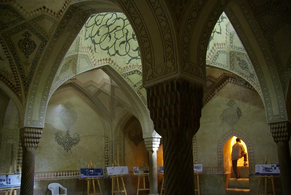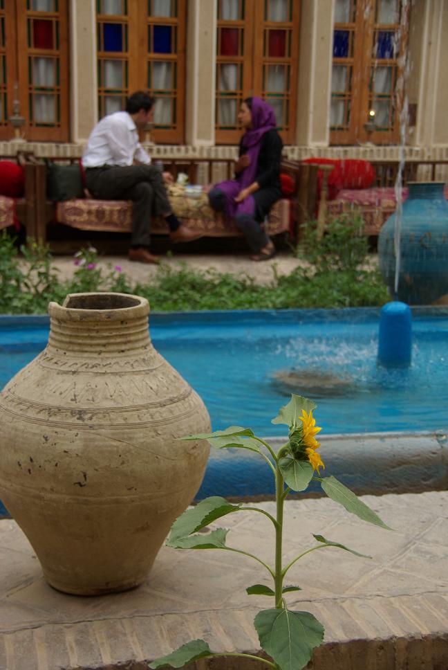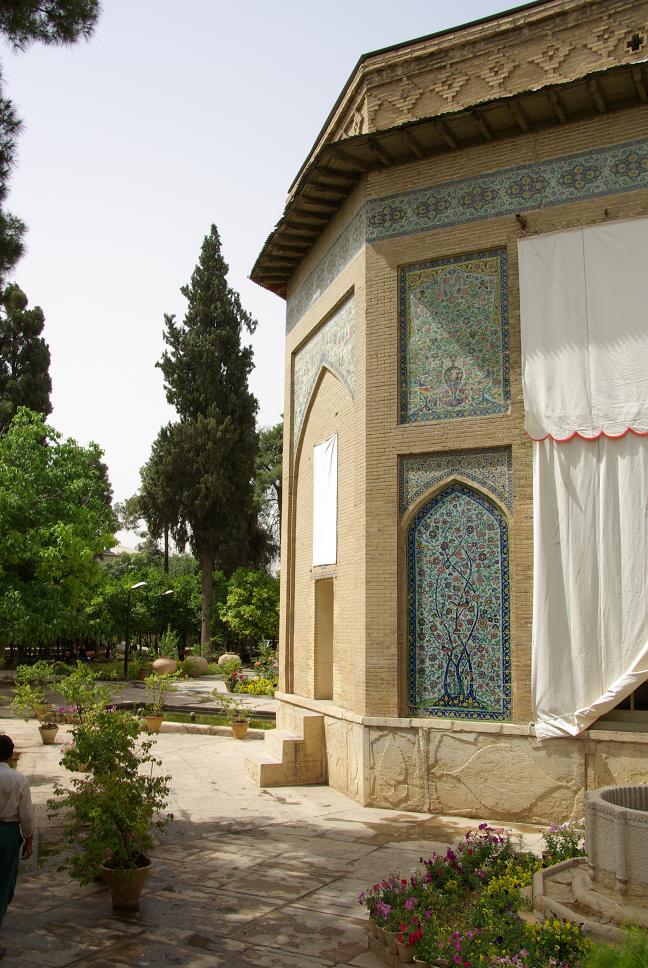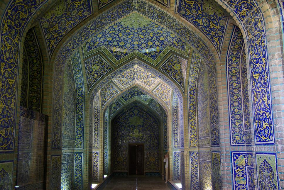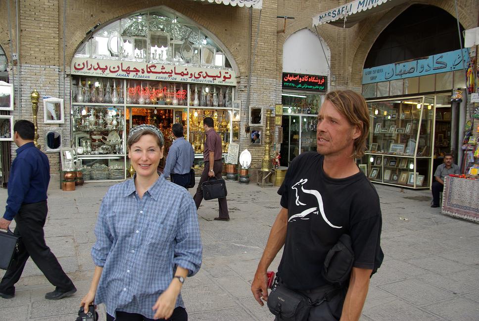Ein Traum in Lapis Lazuli, schade war nur, dass im Innenhof Sonnenplanen gespannt waren und so etwas die Sicht verdeckten. Einfach genial. Danach schlug ich noch bei einem Emailliermeister zu und erstand eine kleine blaü Emailvase mit der für Isfahan typischen Bemalung. Ein Souvenir, dass auch irgendwie speziell ist. Danach liess ich mich von einem "Taxi" zum Hotel fahren und haute mich etwas aufs Ohr, nachdem ich was im Internetcafe getippt hatte (s.o.). Kai und Anette weckten mich etwas später und wir gingen zum nicht weit entfernten Hotel Abbasi zum Essen. Das war mal wohl ein Ballsaal, war richtig edel und ich konnte mal wieder Fesenjun probieren (Huhn in Granatapfelsosse, lecker!). Anschliessend musste ich mir noch eine Sonnenbrille kaufen, weil ich meine wohl im Taxi verloren hatte. Ich wollte die allerbilligste und liess mich auch nicht durch den Verkäufer beirren, der mir Markenware verkaufen wollte. Die sollte 150000 Rial kosten, also ca 11 Euro. Ich redete mit dem Verkäufer gerade über Touristenpreise wenn die Touristen abgezockt werden, da legte sein Kollege eine Rechnung mit 350000 vor! Ich bestand auf den 150000. Der Verkäfer intervenierte bei seinem Kollengen und siehe da, sie kostete nur 150000. Sichtlich verlegen verabschiedete er sich, denn gerade hatten wir noch darüber geredet, hehe...