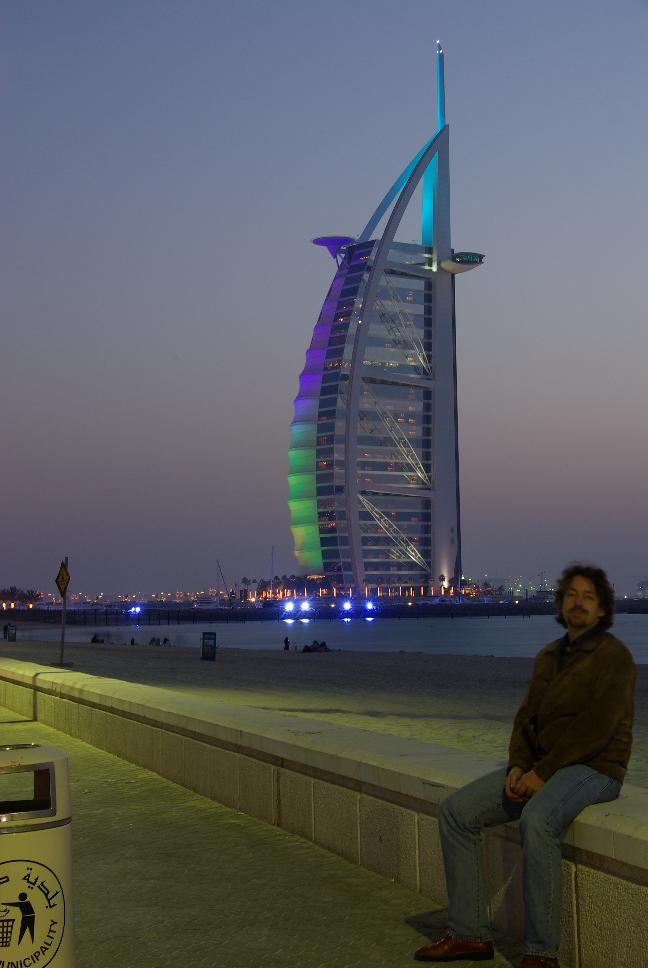 Ich machte noch ein Bild von dem freundlichen Herrn und versprach es ihm zu schicken. Ich bekam im Büro eine Karte und wäre sogar auf einen Tee eingeladen worden, aber ich wollte wegen des Sonnesuntergangs weiter. Die Sonne geht hier aber so schnell unter, dass ich gar nicht so schnell an mein Ziel kommen konnte: Das Burj Al-Arab, einziges Sieben-Sterne Hotel und neüs Wahrzeichen Dubais. Andererseits schalteten sie das Licht ein und das Hotel wurde im Wechsel in verschiedenen Farben bestrahlt.