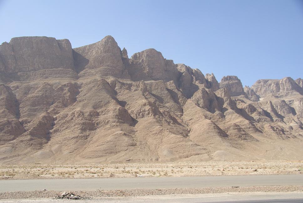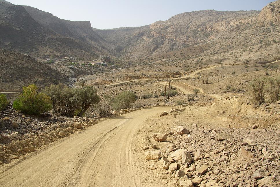 Heute wieder um 6:15 aufgestanden und um 7:15 abgedüst [arabische Software, arabisches keyboard, ascii codes funktionieren nicht, aaaargh!]. Schon wieder diese Hitze, am frühen Morgen! Die Strasse raus in Richtung Flughafen war kein Problem, von dort aus in Richtung Süden in die Berge abgebogen. Es wurde einen Hauch trockener und kühler, nach einer halben Stunde an einer Tankstelle angehalten und gefrüstückt. Die Tankstellen unterscheiden dich kaum von den europäischen, mit dem Unterschied dass es keinen Playboy oder ähnliches gibt. Dafür aber Kondome. Langsam tauchten die ersten Berge auf, hoch, karg, schroff aber trotzdem sehr ansehnlich. Ich tuckerte so dahin, obwohl 120 erlaubt gewesen wären, liess ich es bei 100 bewenden, denn das Tagesziel war ja nicht weit entfernt: