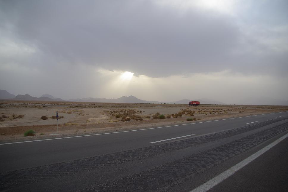Wieder auf der XBR düste ich wieder zurück nach Rascht. Man gewöhnt sich an alles, auch an die schlecht dämpfende Vordergabel. Nur die millionenfachen Bodenschwellen gehen einem langsam auf den Geist. In der Stadt ist es ja noch OK, aber auf überlandstrassen. Ich bog nach Süden auf die Schnellstrasse ab, am Rudbarstaudamm gings runter von der Strasse und auf einer Nebenstrecke nach Gilvan weiter. Der Sturm machte eine Pause unmöglich, er hätte beinahe die XBR auf dem sicheren Hauptständer umgeworfen! Es zogen auch dunkle Wolken auf und ich stelle mich schon mal auf Regen ein. Die Strasse war in einem sehr guten Zustand und plötzlich fülte man sich wie in einer Mondlandschaft.