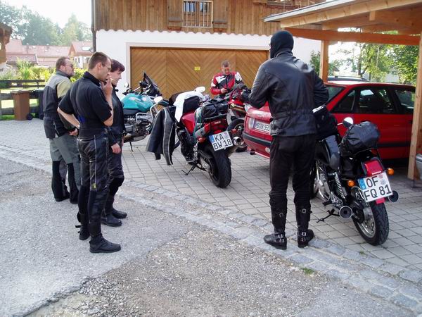Am ersten Tag ging es natürlich nicht wie beabsichtigt um 8 Uhr los (Man spürt förmlich Roberts Ungeduld, gelle). Ralf, Sandra und Oliver hatten hier übernachtet und Peter mit Rolandsowie Johannes mit Erich trafen noch einigermaßen rechtzeitig ein, Martinhingegen, der den kürzesten Anfahrtsweg hatte, brauchte noch etwaslänger.