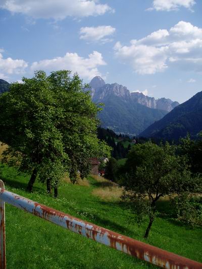 Beim rauf fahren meinte ein Ortskundiger mich ungestraft überholen zu können. Bei der nachfolgenden Verfolgungsfahrt brauste ich an einer Abzweigung vorbei, an der die anderen natürlich abbogen. Als mir das klar wurde waren sie natürlich schon weg. Zur Sicherheit fuhr ich zum Gipfel, irgendwann würden sie schon dort auftauchen, was sie dann auch taten. Das Gipfelhaus ist eine etwas sehr patriotische Reminiszenz an die Schlachten des ersten Weltkriegs, der dort unweit tobte. Der Weg führte uns weiter über Almwiesen nach Arsiè. Wir suchten den Schatten und machten im Tal mal kurz Pause. Das Problem war nur, dass Erichs Gummikuh nicht mehr ansprang. Da half auch mehrmaliges Anschieben nicht. Irgendwann klappte es aber doch, kurz vor der totalen Ermattung.