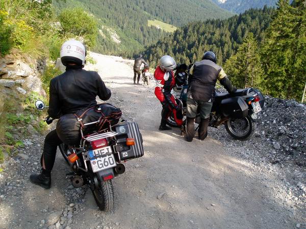 Die anderen fuhren inzwischen los, aufgeteilt in zwei Gruppen. Ich führtedie Gruppe A an, welche etwas weiter fuhr und auch mal auf unbefestigtenStrecken unterwegs war. Gruppe B, geführt von Peter, ließ es etwasruhiger angehen. Zu fünft (Johannes, Erich, Ralf, Roland und ich) fuhrenwir über kleine Bauernsträßchen zunächst zum Tegernsee unsvon dort aus weiter zum Achensee. Das Wetter war dem Anlass angemessen vomfeinsten, Sonnenschein und blauer Himmel. Mir fiel unterwegs das entsetzlichekipplige Fahrverhalten meiner XBR auf. Ich hatte kurz vorher noch neue Reifenaufziehen lassen und vermutete einen schief eingestellten Hinterreifen, wasaber nicht zutraf. Etwas ratlos fuhr ich weiter und machte mir schon Gedankenwie ich diese Woche überstehen sollte, als ein Geistesblitz mich rettete.Bei der Überprüfung des Reifendrucks stellte sich heraus, dass erüber 3 bar betrug, die Werkstatt also nach dem Aufpumpen den Druck nichtwieder abgelassen hatte. Danach war wieder alles im Lot. Im Zillertal ging esrechterhand rauf zur Zillertaler Höhenstrasse, welche uns tolle Ausblickeins Zillertal bescherte.