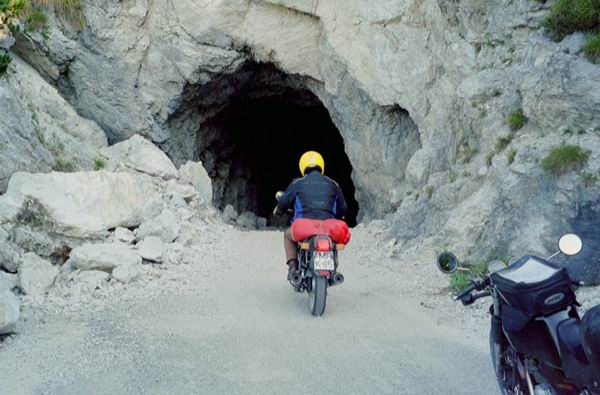Oben angekommen war ein Stück frisch geteert, aber dann wurde es interessant: die ausgesetzte Straße mit Galerien, Tunnels und immer wieder fantastischen Ausblicken.