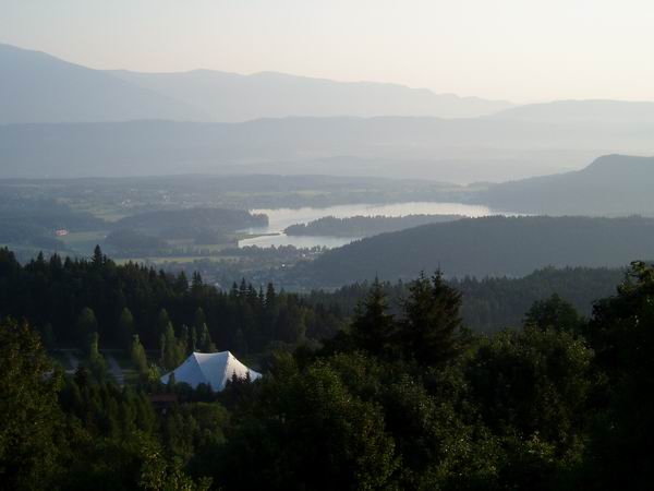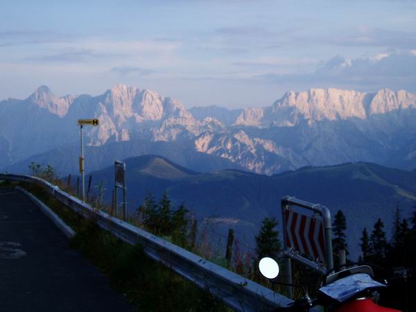Da die Zeit schon etwas fortgeschritten war, entschlossen wir uns das Gailtalauszulassen und stattdessen unsere Herberge direkt anzusteuern. Über dasNassfeld ging es also zur Feistritzer Alm und zu unserer Herberge, demBaumgartnerhof. Hoch über dem Faaker See gelegen, hat man von dort auseine fantastische Aussicht. Wir bezogen schon mal unsere Zimmer und da diezweite Gruppe noch auf sich warten ließ, brachen wir noch einmal zu einerAbendtour zur Villacher Alpenstrasse auf. Der mächtig aufragende Kegel waruns schon vom Hotel aus aufgefallen. Die Straße ist untertags fürMotorräder gesperrt, aber da es schon nach 18h war, durften wir miterlaubten 30 km/h hinauffahren.