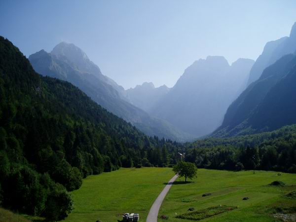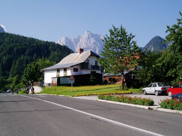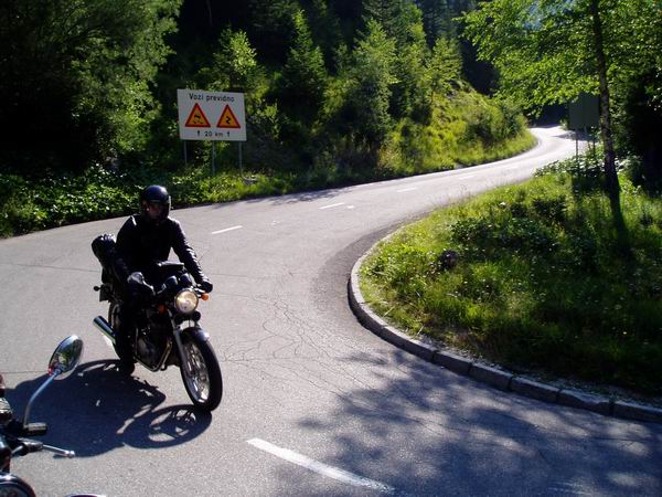 An der Grenze fuhr ich im Schritttempo an dem österreicherischen Grenzhäuschen vorbei, der Zeitung lesende Beamte schien sich ja nicht für mich zu interessieren. Ein lautes „Halt!“ erschallte aus dem Häuschen und der kärntnerisch/bairische Austausch von Liebenswürdigkeiten ging in die zweite Runde. Nach einer gründlichen Überprüfung der Papiere durften wir endlich aus Österreich ausreisen (!). In Slowenien ging die Einreise mit einem Durchwinken über die Bühne. In Kranska Gora ging es hinauf zum Vrsic Pass, eine landschaftlich sehr schöne Strecke, die z.T. in Haarnadelkurven mit Kopfsteinpflaster. Die Passhöhe war zugeparkt und mit Leuten überschwemmt, wobei der Grund nicht ersichtlich war. Die Abfahrt ist ein Leckerbissen, im Gegensatz zur Auffahrt mit gutem Asphalt und netten Kurven.