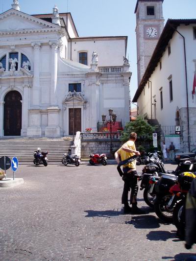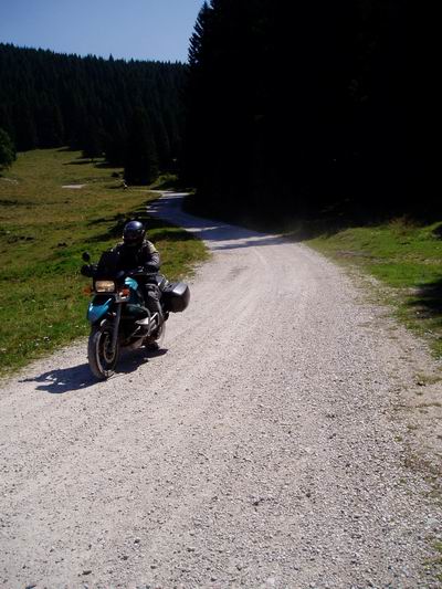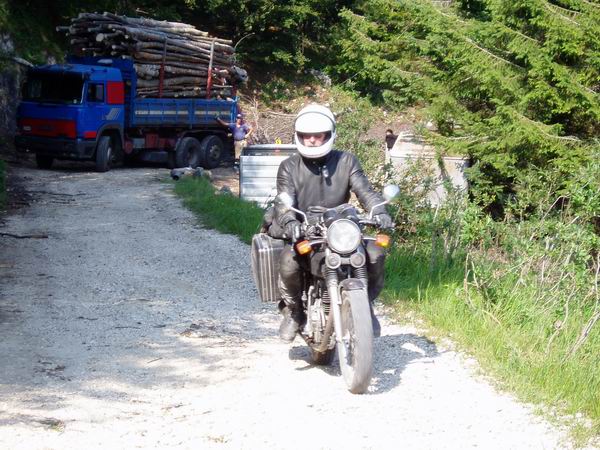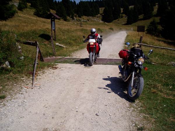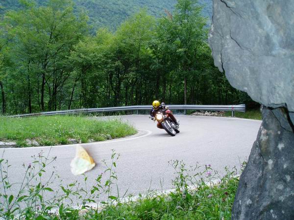 In Paularo hatten wir wie bei einer früheren Alpentour das Problem denEinstieg zum Passo di Cason zu finden. Zu allem Überfluss verloren wir unsauch noch, was einen Espresso dauerte, bis wir uns in der Ortsmitte wiedertrafen. Die Auffahrt zum Pass war sehr schmal und bei Gegenverkehr musste mansich schon etwas dünn machen. Die Abfahrt ist offiziell gesperrt, da dieStrasse abgerutscht ist. Es wurde allerdings eine Piste angelegt, die zwarnicht durch den leichten Schotter anspruchsvoll wurde, jedoch durch dieSteigung, welche bei einigen zu einer nervösen rechten Hand führte.Durch viele kräftige Hände gelang es wieder die lieblos hingeworfenenXBR und BMW wieder aufzurichten und die Schlüsselstelle ohne weitereBlessuren zu passieren.