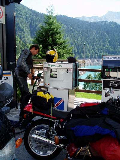 Über kleine Strassen gelangten wir zur Auffahrt zum Forcella di Monte Rest, unterwegs überholten wir wieder die Gruppe B. Die Abfahrt war wieder ein Leckerbissen, Kurve an Kurve gereiht. Die zahlreichen Bremsspuren vor den Kurven deuteten darauf hin, dass hier vor kurzem eine Rallye stattgefunden hatte. Auf der gegenüberliegenden Seite ging es wieder zum Passo di Pura hinauf. Ich fuhr mittlerweile nur noch tuckernd dahin, weil keine Tankstelle zu finden war und der Sprit bald alle war. Zu meiner Überraschung fanden wir eine Tankstelle, die auch noch offen war.