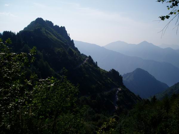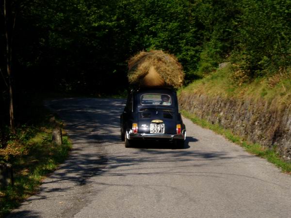 Das Frühstück ließen wir uns in aller Ruhe schmecken und nach der Anstrengung am vorherigen Tag hatten alle keine Eile. Ich las den Corriere della Sera in dem die Schlagzeile lautete: Hitzerekord! In Mailand und Turin hatte es 39°C gehabt, die gefühlte Temperatur betrug aber wegen der hohen Luftfeuchte über 50°C! Das Gute an dieser Nachricht war, dass es wohl die nächsten Tage sehr schön sein würde, das Schlechte daran, dass die Temperaturen kaum sinken würden. Die Gruppe A bestand wieder aus Johannes, Ralf und mir, Erich war nicht aufgetaucht, ein Kontrollanruf bei ihm zuhause erbrachte dass er noch in Bozen saß und auf einen neuen Anlasser wartete, der bald eintreffen sollte. Um halb zehn ging es endlich los, zunächst auf die andere Seeseite nach Anfo und dann hoch zum Passo del Maniva. Wie am Vortag ging es gleich richtig los, Kurve an Kurve windet sich das Teersträßchen den Berg hinauf, unterhalb der Idrosee, auf den man eine tolle Aussicht hat. Unterwegs fuhren wir hinter einem alten 500er FIAT hinterher, der nicht nur drei Personen den Berg hinaufbringen musste, nein, sondern auch noch auf dem Dach einen riesigen Heuballen gebunden hatte!