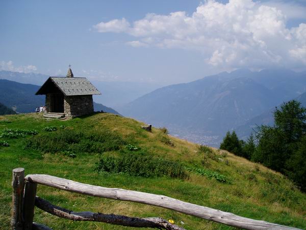Nach dieser Panoramastrecke ging es hinüber auf dem Plateau an Pferdeherden vorbei in Richtung Passo Croce Domini. Das letzte Stück zum Pass düste wieder mal Johannes mit Schmackes vorbei, die kurze Abfahrt war etwas kniffliger, denn man will ja nicht mit dem Ziel vor Augen auf die Plauze fallen. Die am Pass stehenden Chopperfahrer staunten nicht schlecht, als Ralf und ich daherkamen. In die Gegenrichtung starteten zwei Crosserfahrer, die es ordentlich krachen ließen, kein Wunder bei den Maschinen. Den Passo runter hatten wir auch viel Spaß und ich dachte daran, wie ich einmal auf dem verschneiten Pass auf der Strasse übernachten musste. Als wir in Breno angelangt waren, ließen wir aufgrund der vorgerückten Zeit den Schlenker über Schilpario aus sondern machten uns auf dem direkten Weg nach Edolo. Dort wurde getankt und in einem Supermarkt eingekauft, denn wir wollten irgendwo weit oben Brotzeit machen, unten wurde es langsam unangenehm heiß. In Monno ging es dann zum Passo della Foppa rauf, von dort die Hochstrasse über den Passo di Guspessa nach Trivigno entlang. Man hat von dort oben eine Aussicht nach Süden sowie nach Norden in Richtung Berninamassiv.