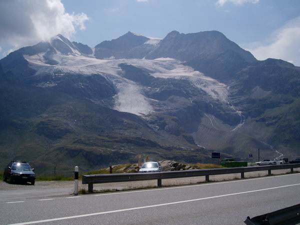 Mit der Zeit wurde es uns ganz schön warm, was Johannes zu seinem ersten Lederkombistrip verleitete. Leider mussten wir wieder ins Tal und von dort zum Passo dell'Aprica. Ein paar schöne Kurven später waren wir in Tirano und überquerten die Grenze zur Schweiz. In Poschiavo kamen wir an der Herberge von vor zwei Jahren vorbei. Johannes rief mir zu anzuhalten und eine Pause zu machen. Na ja, da wir gerade erst die Mittagspause hinter uns hatten, dachte ich dass wir besser auf dem Berninapass anhalten, denn dort würde es mindestens 15°C kühler sein. Irgendwann hielt Johannes plötzlich an, riss sich unter Stöhnen und Jammern Helm und Jacke vom Leib und steckte seinen Kopf in den Brunnen mit eiskaltem Wasser. (Lederkombi ab 30 Grad ist Mord....) Ralf und ich sahen uns verdutzt an, denn es war schon heiß, aber dem Hitzekoller waren wir noch nicht so nahe. Johannes Wärmeisolation war ja schon enorm, erst die körpereigene und dann noch der eng anliegende Lederkombi, der sich natürlich schlecht kühlen lässt. Nach der Abkühlphase fuhren wir weiter den Bernina rauf. Dort trafen wir auf die Gruppe B, die wieder mal bei ihrer obligatorischen Rauchpause waren. Die Aussicht auf das Berninamassiv war auch bestürzend: Das ewige Eis wird es wohl nicht mehr lange sein, auch hier war der starke Rückgang der Eismassen in den letzten Jahren offensichtlich.