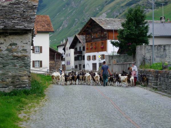 Hinunter ging es in lang gezogenen flüssigen Kurven bis nach Pontresina, als wir auf einmal in einen Mordsstau kamen. Alleine kommt man natürlich noch einigermaßen voran, aber die anderen müssen ja auch noch nachkommen. Grund war eine halbseitig gesperrte Straße, danach ging es wieder flüssig weiter. Durch St. Moritz und am Silser See vorbei gelangten wir zum Malojapass. Die spektakulären Kurven hinab in das Bergell waren einer der Höhepunkte des Tages. Unten angekommen machten wir am Straßenrand Pause und taten was für unseren Flüssigkeitshaushalt und tranken ein Käffchen und Wasser. Auch nach längerem Warten war von der Gruppe B noch nichts zu sehen, damit war klar dass wir heute Abend länger auf sie warten würden. Das Bergell zu fahren ist immer ein Genuss, mittlerweile ist es leider etwas ausgebaut, aber die hoch aufragenden Berge und die malerischen Dörfer entschädigen dafür. Kilometer für Kilometer wurde es wärmer und wärmer und langsam zogen Gewitterwolken auf. In Chiavenna war es dann ziemlich schwül und ich war froh, dass es gleich wieder zum Splügenpass hochging. Unterwegs blieb ich noch an einer Kreuzung am Vorderrad eines nach rechts ausscherenden Autos hängen, was außer viel Geschrei aber keine Folgen hatte. Tja, Rückspiegel sollten auch mal von italienischen PKW-Fahrern benützt werden. Den Splügenpass rauf wurde es spannend: Es fing zu tröpfeln an und ich hatte keine Lust, den Regenkombi anzuziehen. Auf der nördlichen Seite würde es doch wohl trocken sein. Und tatsächlich, ab der Passhöhe hörte es wieder zu regnen auf. Leider war die Fahrbahn aber ziemlich nass und die zahlreichen Serpentinen machten nicht so richtig Spaß. Ich zuckelte so vor mich hin, dass Ralf schnell näher kam. Mit nassen, schlüpfrigen Straßen hab ich es halt nicht so. Unten in Splügen wurden wir von einer Geißenherde aufgehalten und hatten Gelegenheit ein kleines Päuschen zu machen.