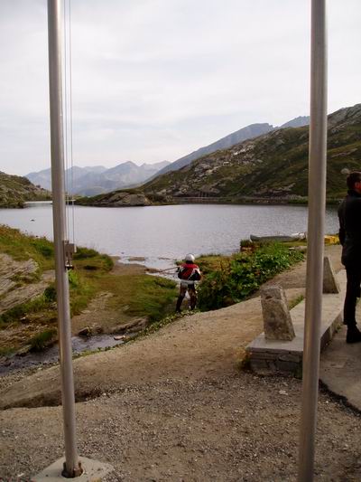 Tatsächlich war es dort trocken, es hatte sogar wochenlang kaum geregnet aber der Rhein führte Hochwasser. Dieses Wasser stammte nicht aus Regenfällen, sondern aus Gletscherschmelzwasser. Der heiße Sommer hatte noch eine weitere Hitzewelle zu bieten, die wir jetzt voll zu spüren bekamen. Dort oben war es wenigstens kühl und wir wollten noch weiter hinaus. Zum Pass hinauf bot sich die Gelegenheit, mal richtig so schön Gas zu geben. Na gut, was halt so geht mit einem ausgelutschten Motor und einiges an Gepäck. Aber für zwei GS 1000 reichte es dann doch noch, hähä. Oben wurde wie immer am Pass eine kleine Rast eingelegt.